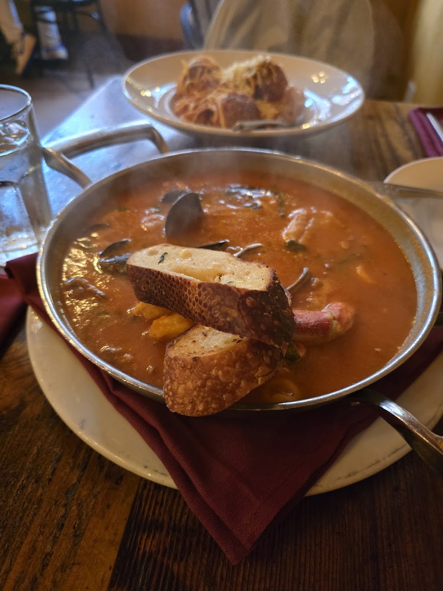 On one visit, I sat near the open kitchen and watched the cooks build the stew step by step-starting with sautéed onions and garlic, then tomatoes, herbs, wine, and finally the seafood in carefully timed intervals. That process matters. Research from the Culinary Institute of America highlights that staggered cooking is essential when working with mixed shellfish, since each protein cooks at a different rate. You can taste that care in every spoonful.